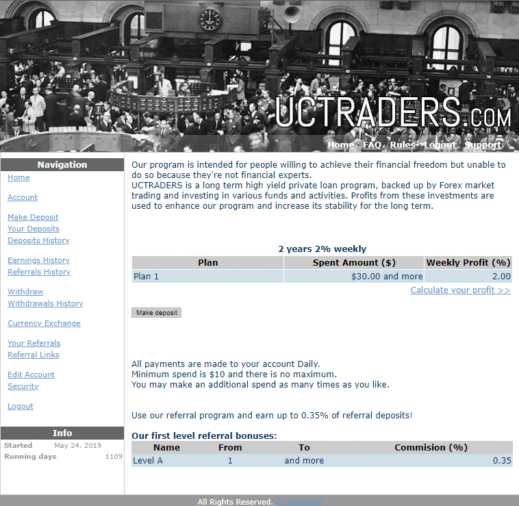Наша программа предназначена для людей, которые хотят добиться финансовой свободы, но не могут этого сделать, потому что не являются финансовыми экспертами. UCTRADERS — это долгосрочная высокодоходная программа частных кредитов, подкрепленная торговлей на рынке Форекс и инвестированием в различные фонды и виды деятельности. Прибыль от этих инвестиций используется для улучшения нашей программы и повышения ее стабильности в долгосрочной перспективе.