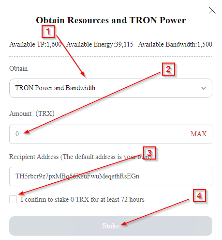 2. Сюда Вводим сумму TRX. Сколько у Вас есть на балансе, столько и вводим (целое число). У меня 1,601, значит, я ввожу 1,601.
