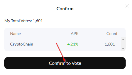 Появилась возможность вводить цифры, как раз под этой самой кнопкой. В списке позиций Вам необходимо найти «CryptoChain». И проголосовать за него. Он дает хороший процент за голоса, и самое главное, если не голосовать за других — дает еще бонусом накопительный процент. Обращаю внимание, что не нужно голосовать каждый день. Достаточно сделать это один раз и можно забыть. И так, нашли в графе «Name» «CryptoChain», самая правая колонка в этой же строке: «My Votes». Отдаем все имеющиеся голоса ему: